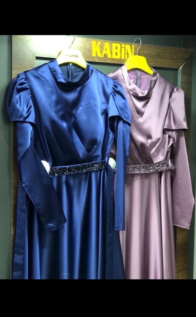 Mor renginde, V yakalı ve askılı kollu uzun abiye elbise. İşlemeli detayları ve parlak kumaşıyla düğünler için uygundur. KABiN markasıdır.