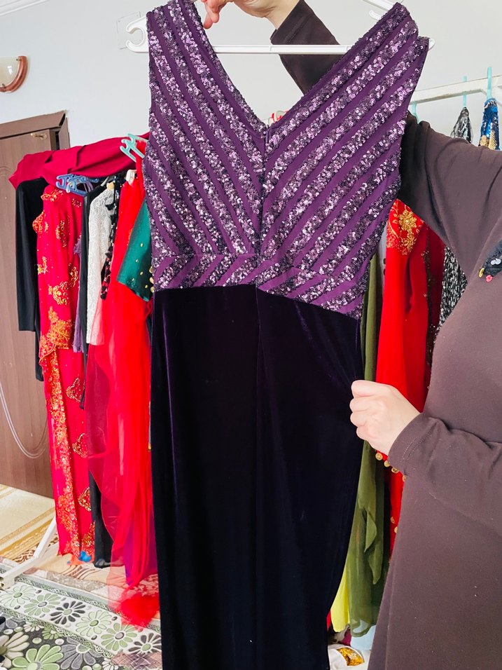 V yakalı, kolsuz, Alt kısmı kadife şık abiye drapeli üst kısmı desenli mor, alt kısmı siyah uzun fitted abiye elbise. Gotik tarzda, gösterişli parti kıyafeti. ✨