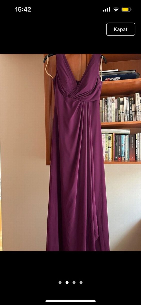 Mor renkte, V yakalı ve drapeli detaylı uzun, fitted kesim kadın elbisesi. Kolsuz ve minimal modern klasik tarzda, düğünler için uygun.