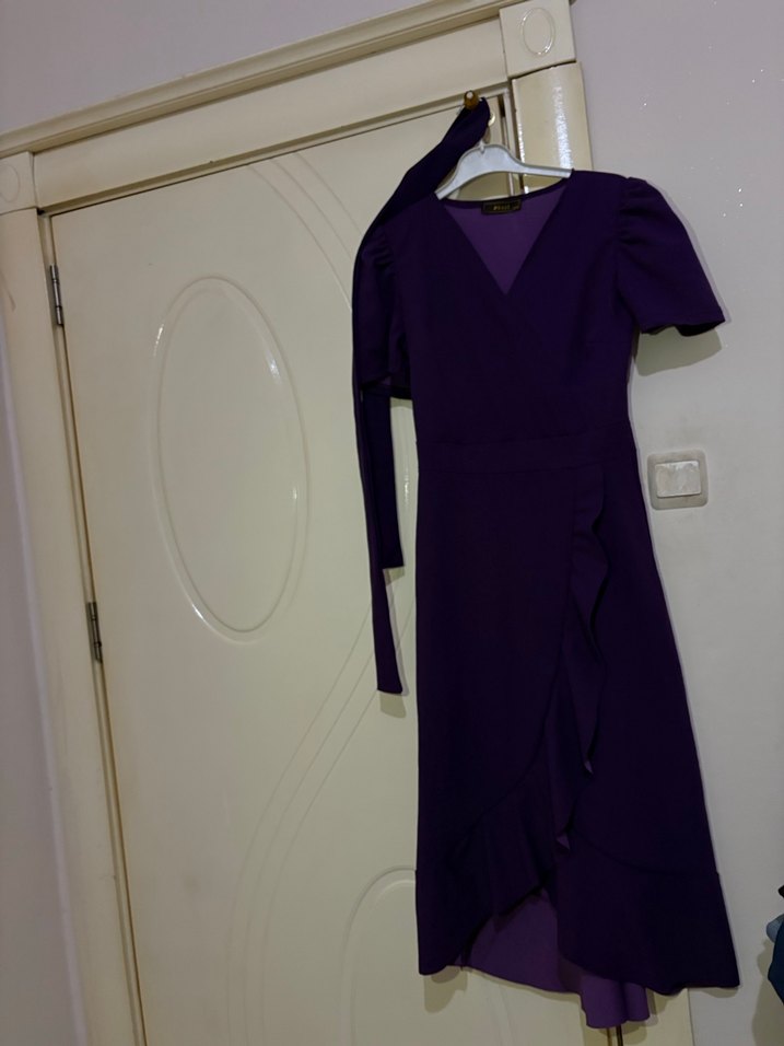 Mor uzun elbise, V yaka, drapeli tasarım ve askılı kollara sahiptir. Düzenli kesim ve koyu, desensiz gotik tarzı sunar. Günlük kullanım için avant-garde dokunuşlu.