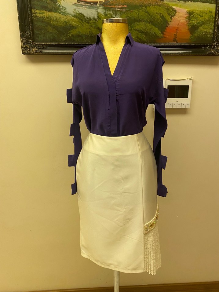 Kadınlar için mor renkli, V yakalı, uzun kollu ve drapeli detaylı, ipek gibi dokuda ofis şıklığı sunan gömlek. Xs beden yazsa da s/ve m bedene olur. Manken 38 bedendir. Göğüs ölçüleriniz büyük ise tercih etmeyiniz.