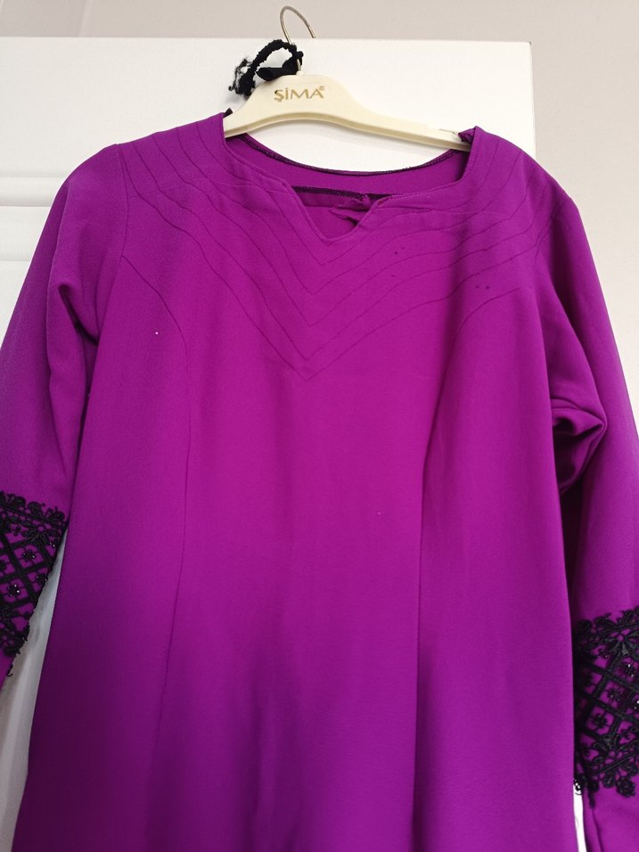 Mor renkte, V yakalı ve uzun kollu, dökümlü detaylara sahip uzun elbise. Sentetik kumaştan, rahat kesim ve minimalist gotik tarzda. Marka: SIMA.