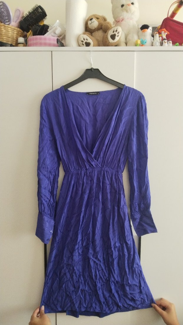 Mor renkli, V yakalı ve drapeli detaylara sahip uzun kollu keten elbise. Rahat kesimi ve bohem tarzıyla günlük kullanıma uygundur.