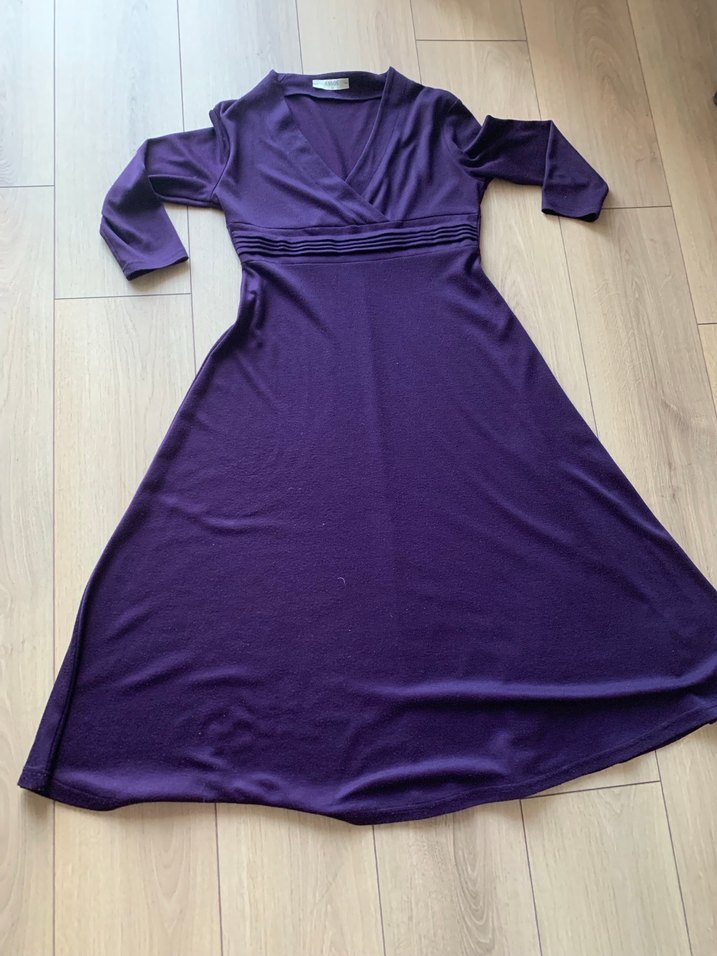 Mor renkli, v yakalı ve uzun kollu kış elbisesi. Düz, oturan kesimi ve drapeli detaylarıyla sade ve şık bir görünüm sunar. 40-42 beden. Koton olması çok rahat kullanım sağlıyor