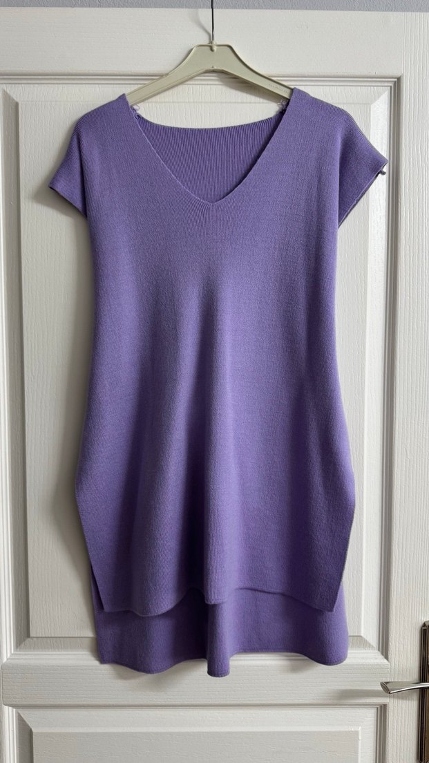 Mor renkli, V yakalı, kolsuz ve rahat kesimli kadın süveter. Yumuşak kumaştan, midi boyda, günlük kullanıma uygun sade ve konforlu tarzda. Standart beden S/M uyumlu