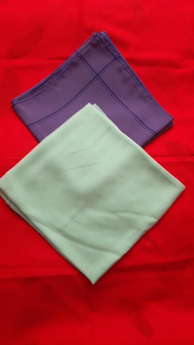 Kadınlar için mor ve açık yeşil renklerde, sentetik kumaştan yapılmış, drapeli, minimalist ve sade çok şık iki adet fular / başörtü. Hiç kullanılmadı. Tertemiz. Fiyat ikisi içindir.