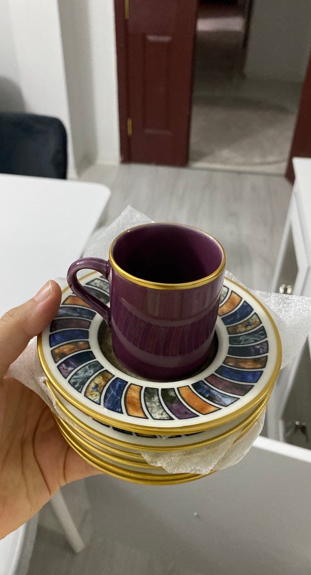 Altın detaylı mor kahve fincanı ve renkli mozaik desenli tabağı olan set. ☕ 6 lı tam takım hiç kullanılmadı