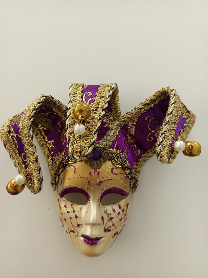 Mor ve altın renkli kumaş üzerine detaylı altın süslemeler ve küçük çanlar bulunan karnaval maskesi.17 cm