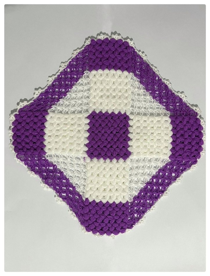 Mor ve beyaz renklerde, el yapımı desenli renkli banyo Lifi. Cilt temizliği için uygundur. 30×30 cm