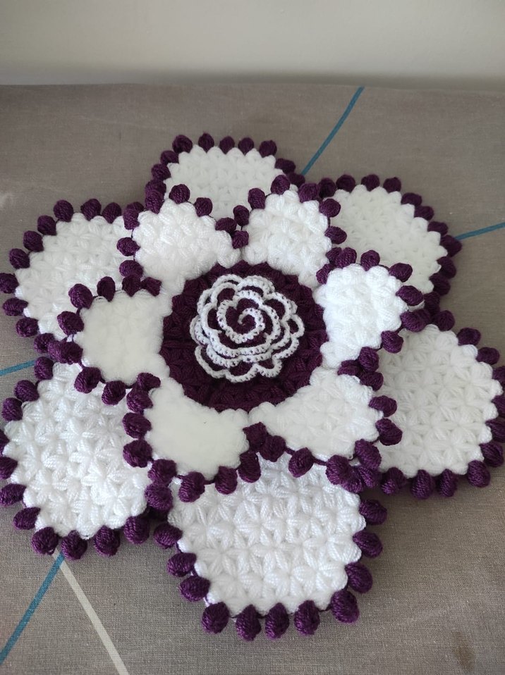 Yumuşak iplikle örülmüş, beyaz yaprakları ve mor kenarları olan çiçek motifli lif