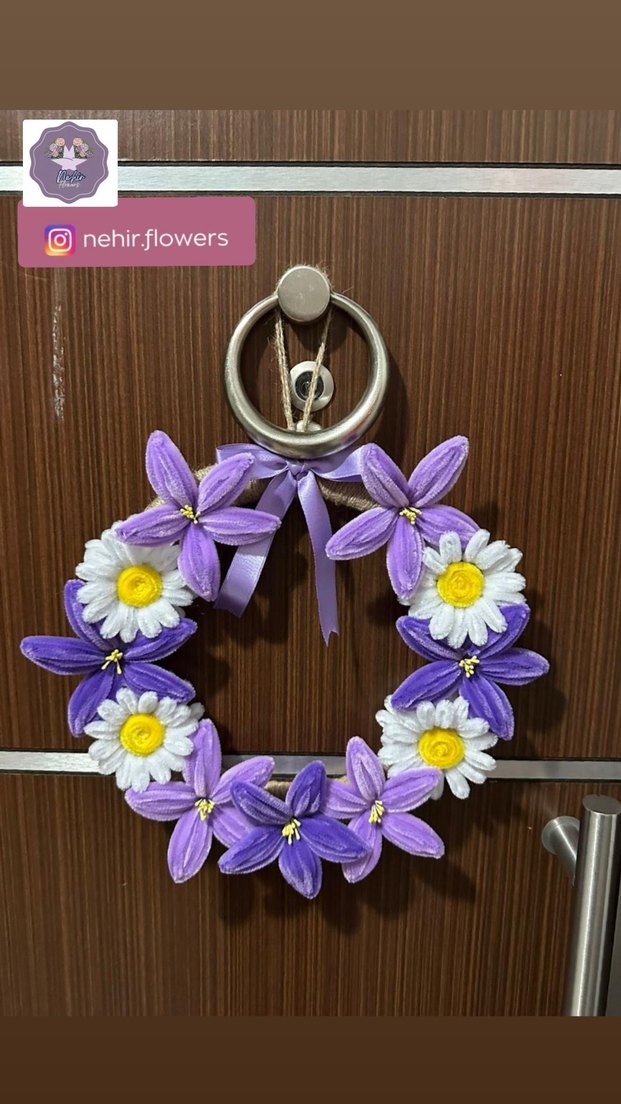 Mor ve beyaz çiçeklerden oluşan, mor kurdele ile süslenmiş renkli kapı süsü. Kapılara neşeli bir hava katıyor. İstenilen renkte yapılır.