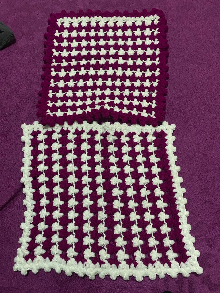 Mor ve beyaz renklerde, dokulu desenli örgü banyo süngerleri. Renkli ve yumuşak dokulu.