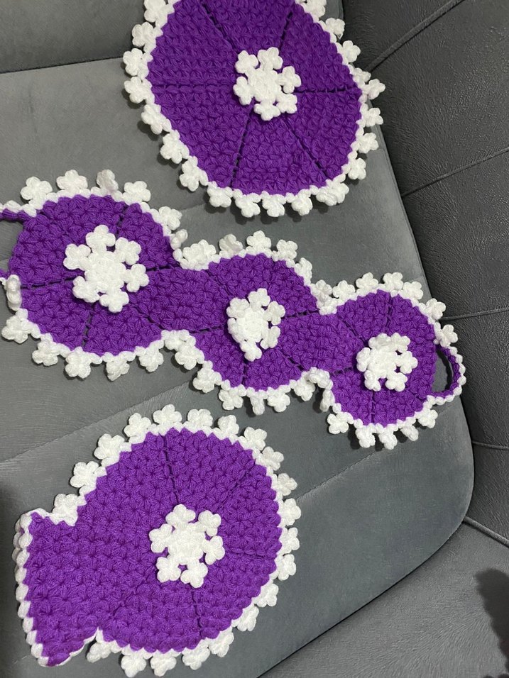 Mor ve beyaz el yapımı örgü süsler, çiçek desenleriyle ve karşı kültür tarzında. İnce işçilik ve özgün şekiller içerir.