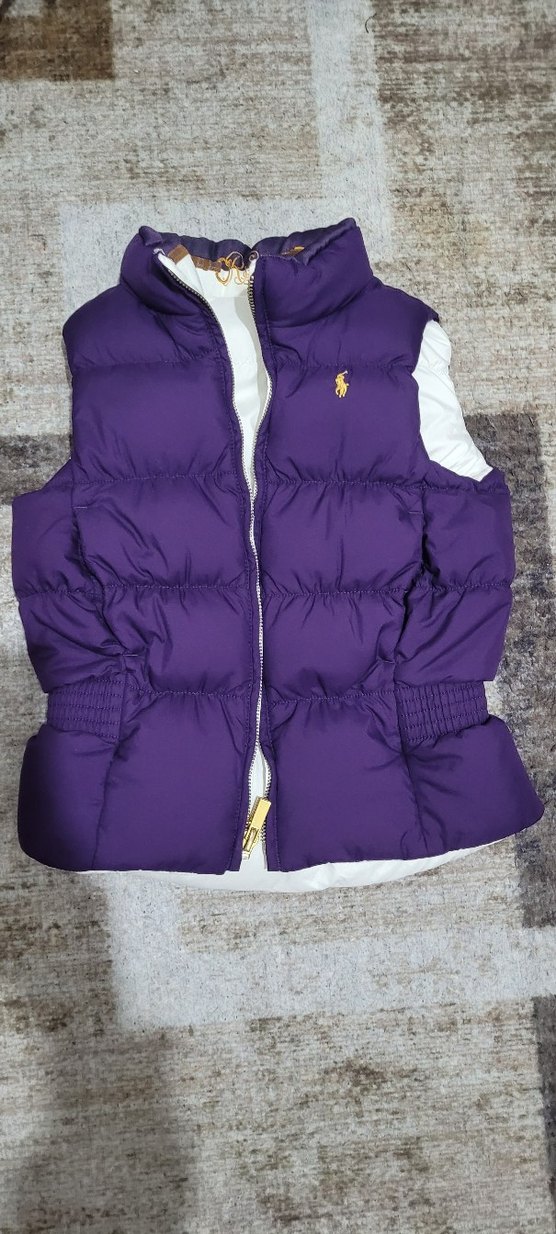 Yumuşak ve sıcak dokulu, mor ve beyaz renkli, kollu olmayan, yakalı ve dar kesim kız çocuk yeleği. Trend sokak giyimi için uygundur. Çift taraflı kullanılır. Birkaç kez kullanıldı, yurtdışından geldi.