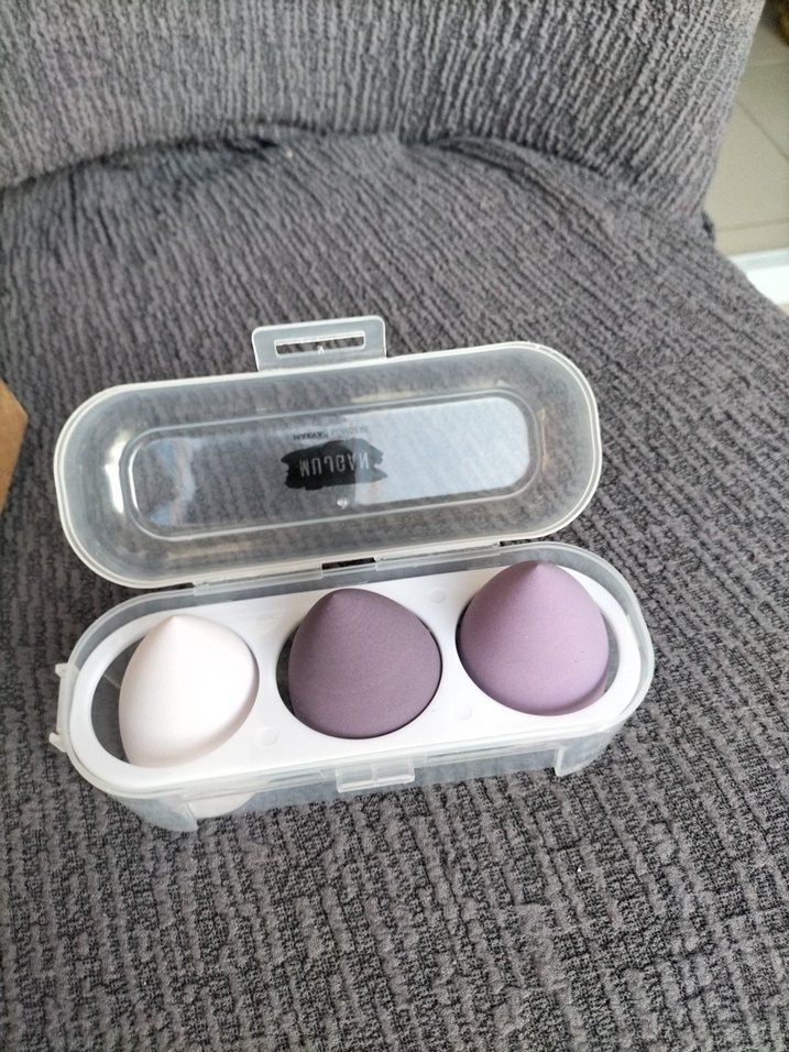 Mor ve gri tonlarda üç makyaj süngeri, şeffaf kutusunda düzenli bir şekilde saklanır. Fondöten ve diğer makyaj ürünlerini pürüzsüzce uygulamak için uygundur.