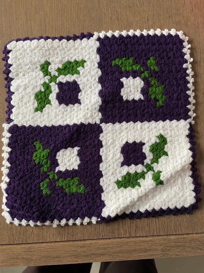 Koyu mor ve beyaz renkli, yeşil yaprak desenli örgü banyo süngeri. Yumuşak dokulu ve dekoratif tasarıma sahip. El yapımıdır.