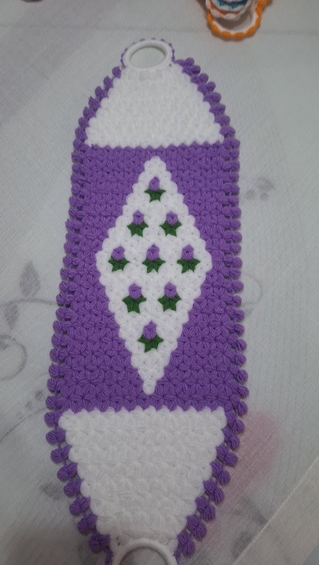 Mor ve beyaz renklerde, dekoratif el örgüsü desenli, yumuşak dokulu banyo süngeri.