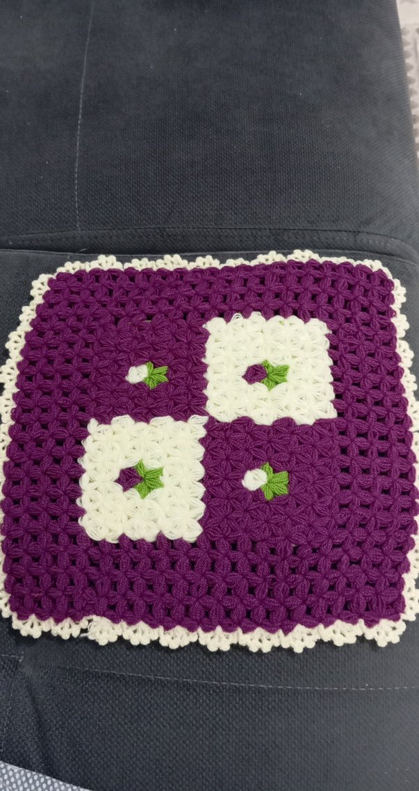 Mor ve beyaz renklerde, çiçek desenli örgü banyo süngeri, yumuşak dokulu.