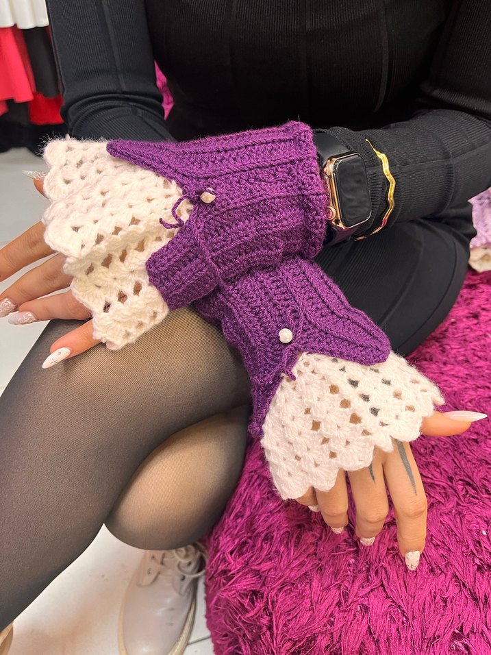 Mor ve beyaz renklerde örgü kadın eldivenler, bohem ve retro gotik tarzı yansıtır. Parmaksız ve el örmesidir.Keyifli alışverişler ️️