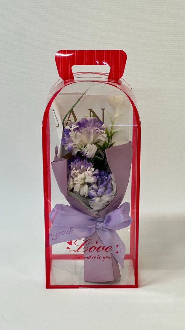 Mor çiçekler ve dekoratif kurdele ile şeffaf kırmızı kutuda sunulan Taşıma sapı bulunur.
