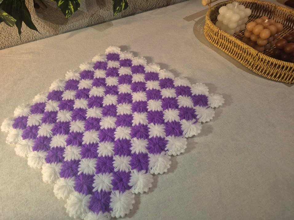 Mor ve beyaz tonlarda örülmüş, el emeği banyo lifi.