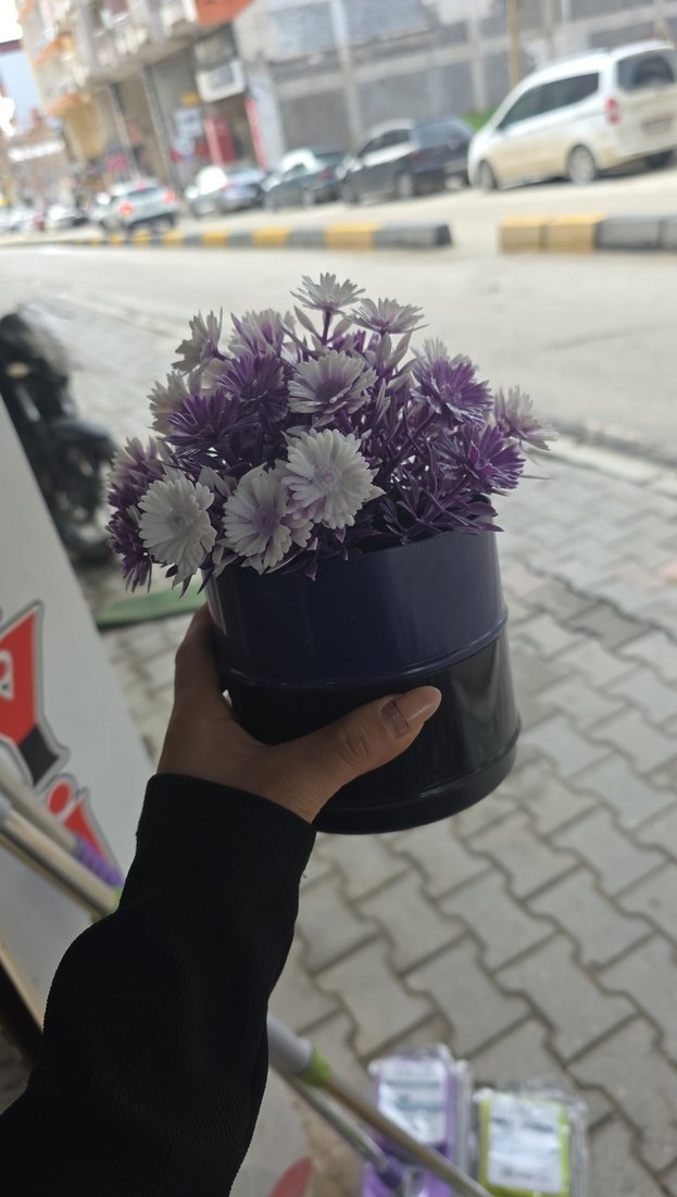 Mor ve Beyaz Yapay Çiçekli Saksı