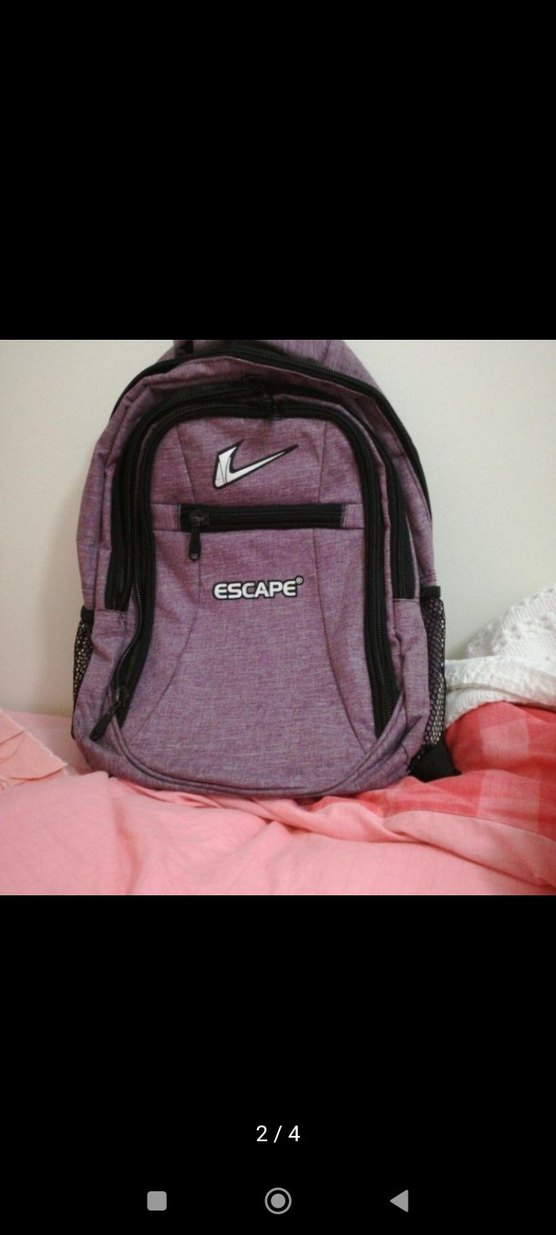 Mor ve gri renklerde, ESCAPE yazılı çocuk sırt çantası. Çoklu fermuarlı bölmeler ve yan file cepler içerir.