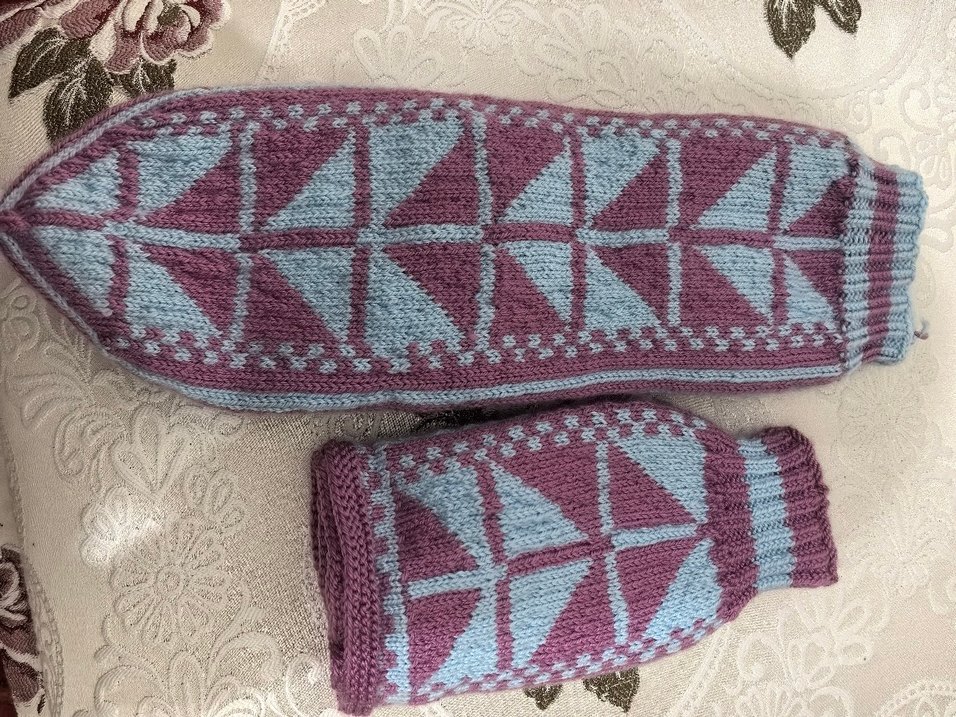Mor ve gri renklerde, geometrik desenli örgü namaz çorap . Sıcak tutmaya uygundur.