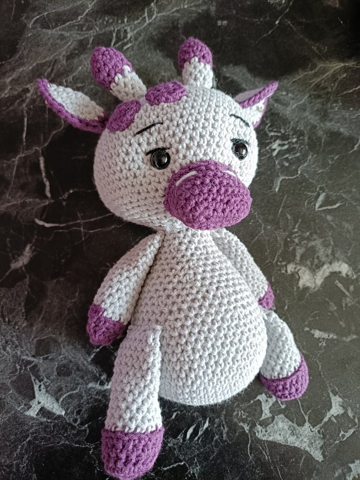 Mor ve gri renklerde el örgüsü peluş oyuncak, detaylı yüz ifadeleri ve yumuşak dokuya sahip. Koleksiyon veya hediye için uygun.