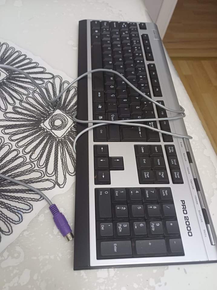 Mor ve gri renklerde kablolu, sayısal tuş takımlı standart klavye. PR02000 model etiketlidir ve PS/2 bağlantısı vardır. ⌨️resimdekiler var calisio calismadigini bilmiyorum