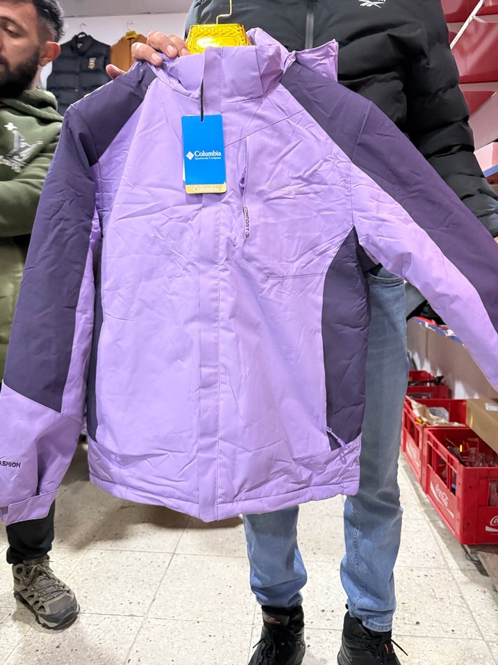 Mor ve gri tonlarda, uzun kollu ve yüksek yakalı, fermuarlı, yumuşak dokulu kadın ceket. Sokak stili ve dış mekan kullanımı için uygundur.