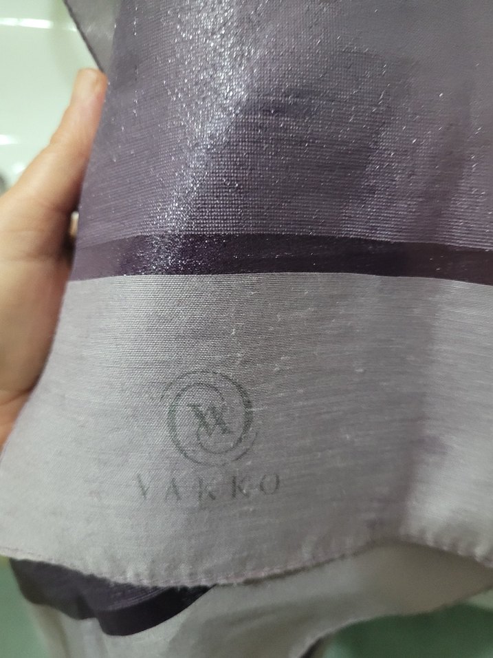 Mor ve gri renklerde, sentetik kumaştan, Velcro kapamalı kadın sargı şal. VAKKO markalı, çağdaş tasarımlı.