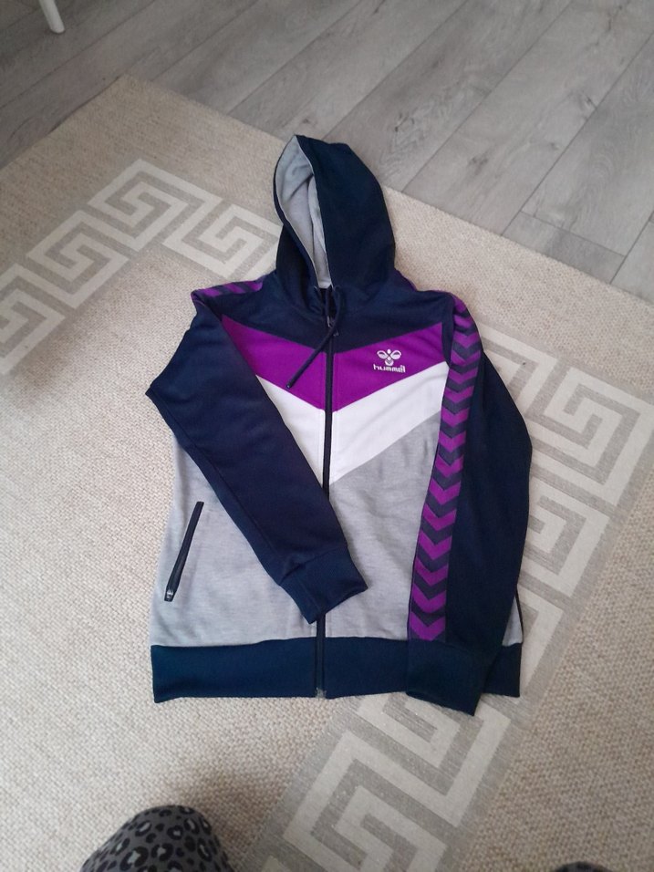 Mor ve gri renklerde, kapüşonlu ve fermuarlı, uzun kollu, normal boyda, vücuda oturan kadın eşofman üstü. Yumuşak ve sıcak kumaştan, baskılı desenli.