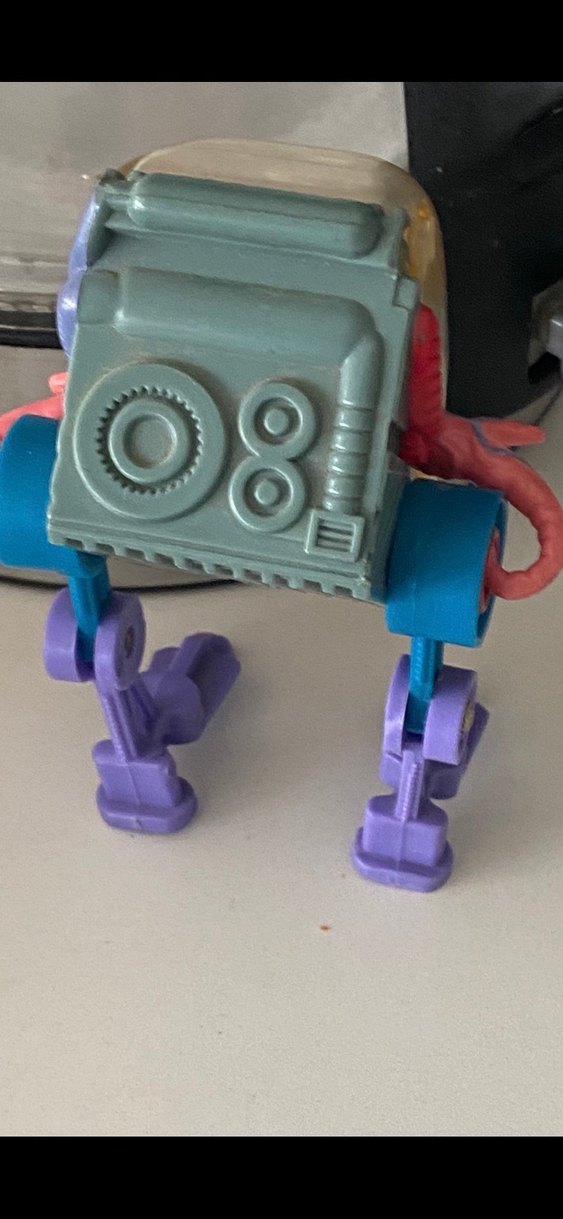 Bu aksiyon figürü, gri gövdeye ve canlı mor bacaklara sahip olup, mavi eklemlerle mekanik detaylar içerir.