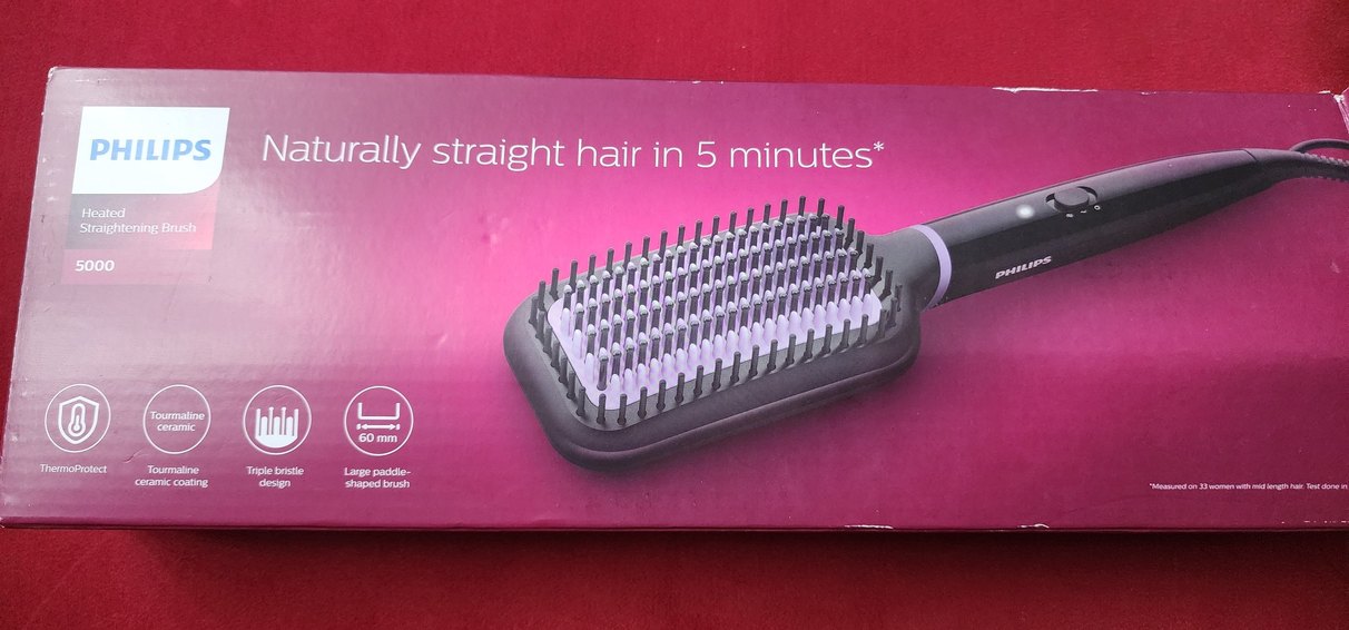 Mor ve gri renklerde saç düzleştirici fırça, 5 dakikada düz saç vaat eder. Kolay kullanımlı ve hızlı şekillendirme sağlar. iki kez kullandim dyson aldigim icin satıyorum. ♀️