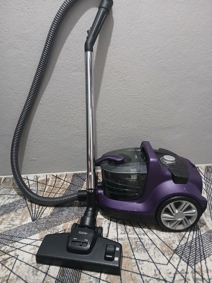 Mor gövde ve gri detaylara sahip toz torbasız elektrikli süpürge, esnek hortumu ve geniş zemin başlığı ile kolay temizlik sağlar. Büyük tekerlekleri hareket kolaylığı sunar.
