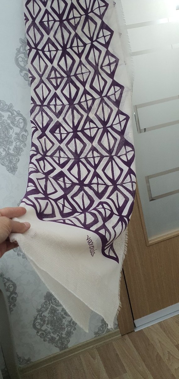 Mor ve krem geometrik desene sahip, yumuşak dokulu, bohem ve avant-garde tarzda kadın şalı. ya da pareo olarak kullanılabilir 2 metre boyunda 83 santim enindedir harika bir terletmeyen kumaşı vardır