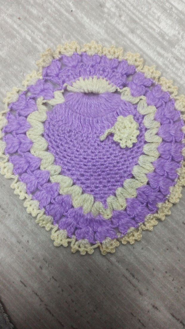 Mor ve krem renklerin kullanıldığı renkli örgü banyo süngeri, yumuşak ve dokulu yapısıyla nazik temizlik sağlar. kendim ördüm çeyizlik