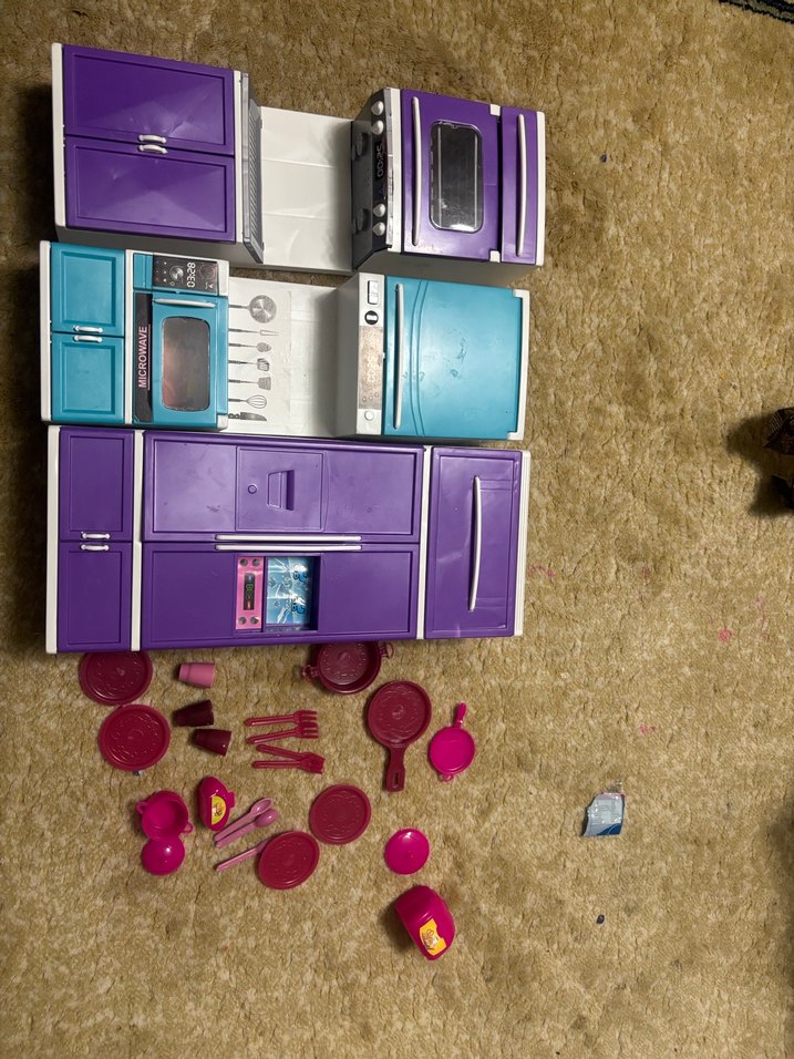 Mor ve mavi dolaplar, fırın, bulaşık makinesi ve çeşitli küçük mutfak gereçleri içeren mini mutfak oyuncak seti. Yeni alındı bir iki kez kullanıldı temiz