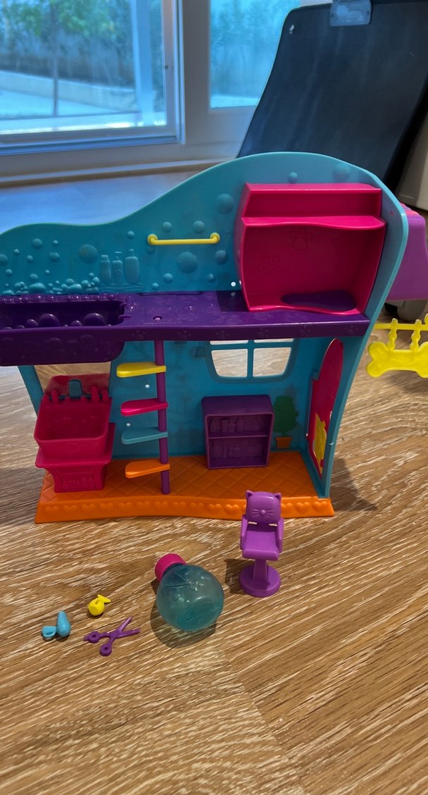 Mor ve mavi renklerde oyuncak ev seti, küçük makas, şişe ve sandalye aksesuarları içerir.