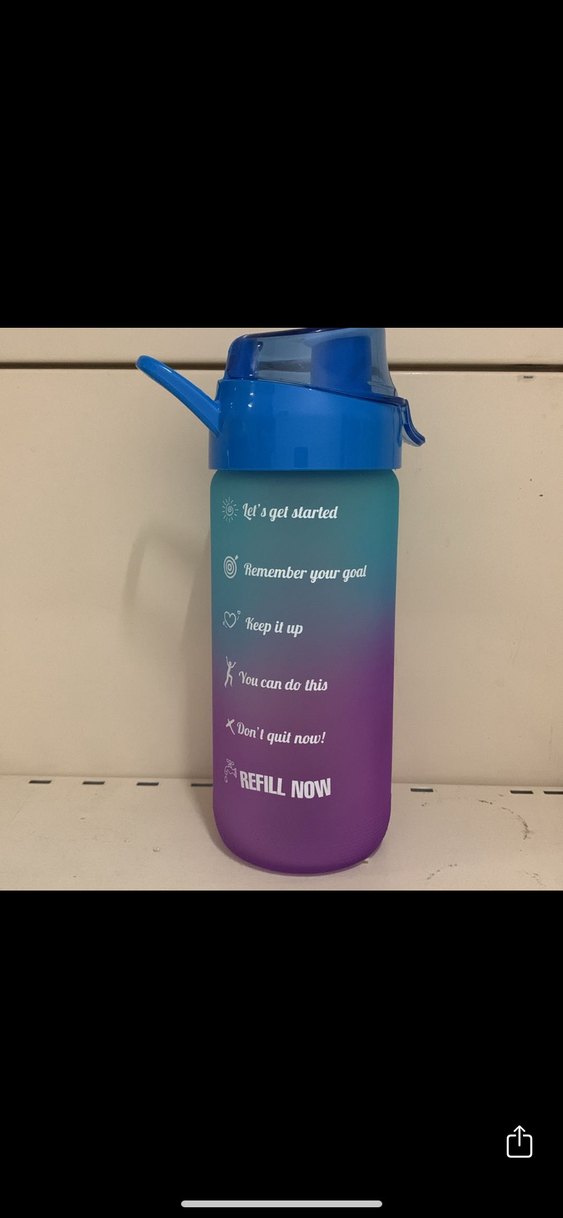 Mor ve mavi renk geçişli, motivasyonel yazılı bebek suluk. Üst kısmı açılır kapaklıdır ve 'REFILL NOW' gibi teşvik edici ifadeler içerir.