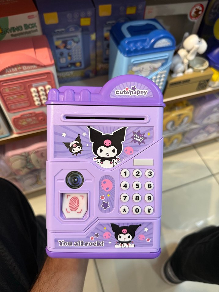 Mor ve mavi renkte, tuş takımı ve parmak izi okuyuculu elektronik kumbara. Eğlenerek tasarruf etmeyi öğretir. Kişiye özel belirlenebilen şifresi bulunur.