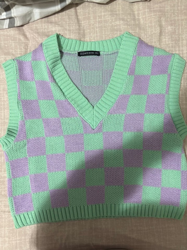 Mor ve mint kareli, V yakalı, triko dokulu, salaş kesim, kolsuz süveter. Standart beden