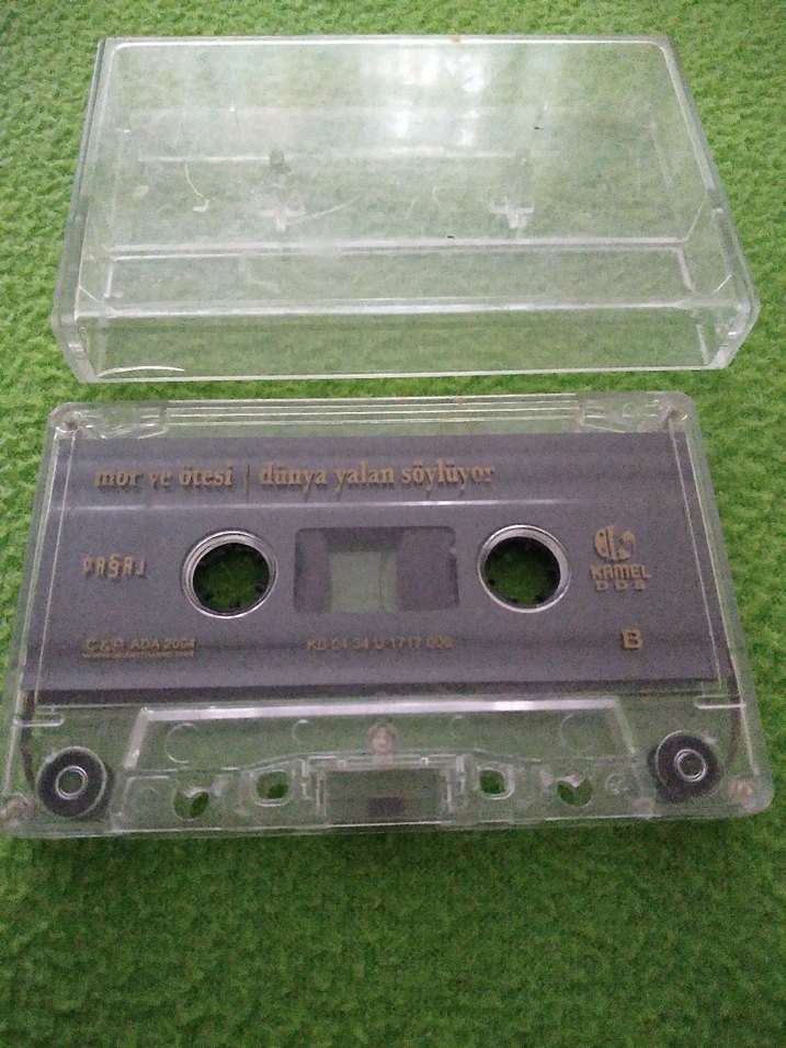 Mor ve Ötesi'nin 'Dünya Yalan Söylüyor' albümünün kaseti, şeffaf plastik kutusunda saklanıyor.