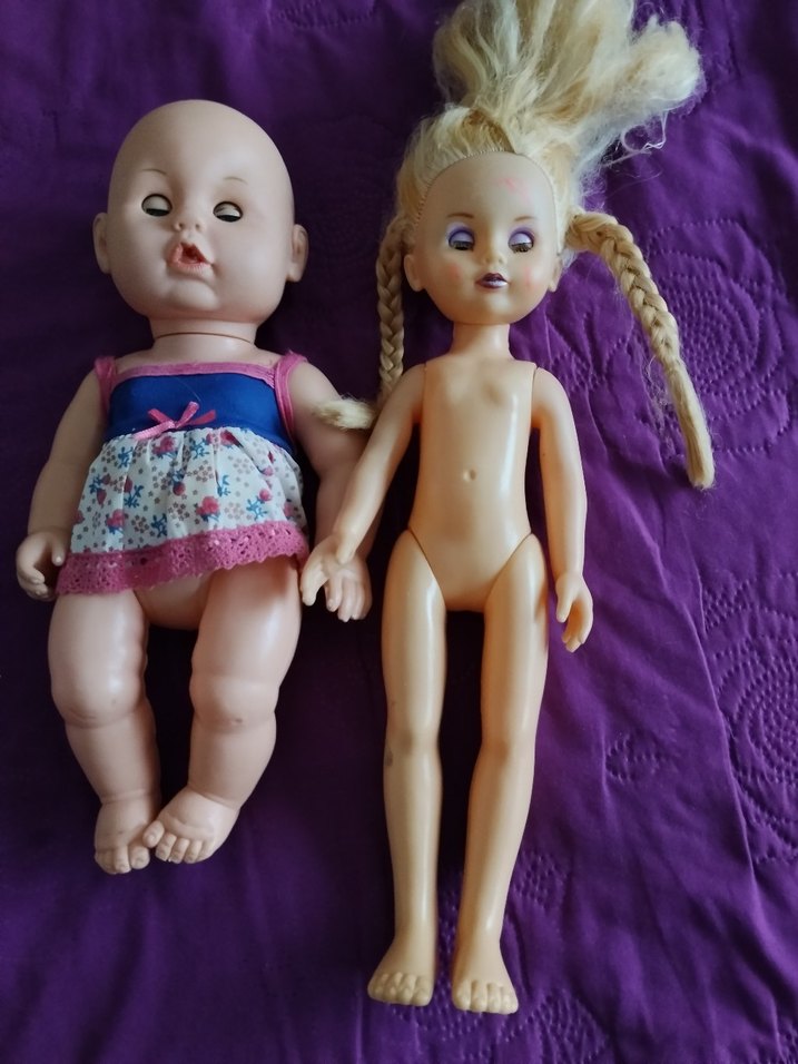 Pastel ve mor tonlarda iki bebek; biri çiçekli kıyafetli, diğeri örgülü saçlı ve çıplak.