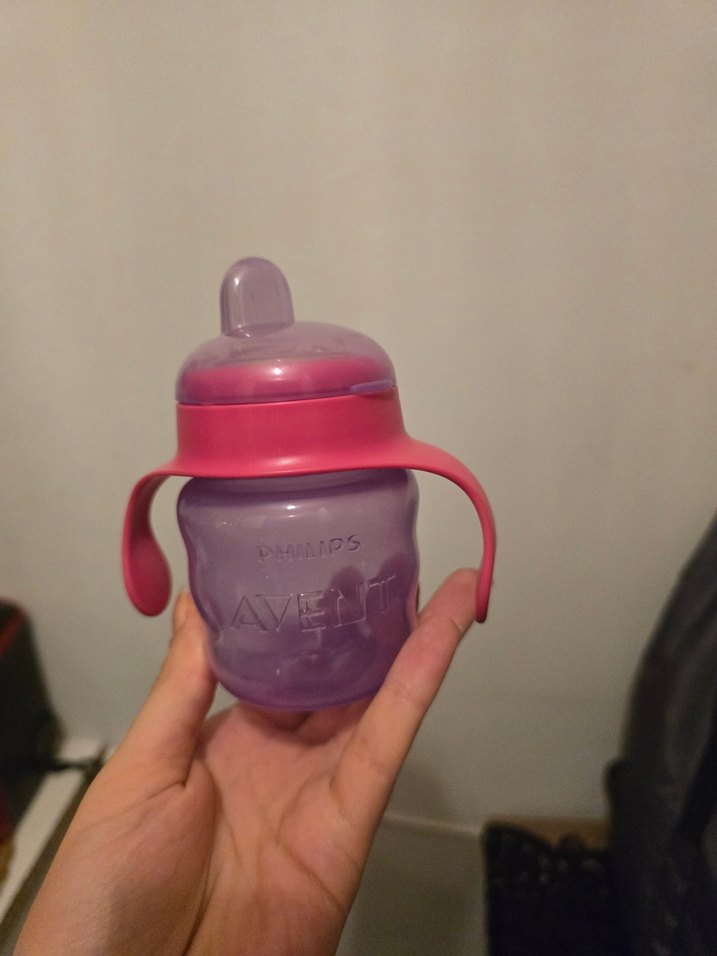 Mor pastel renkte, pembe kulplu ve yumuşak emzikli bebek suluk, küçük eller için uygun.