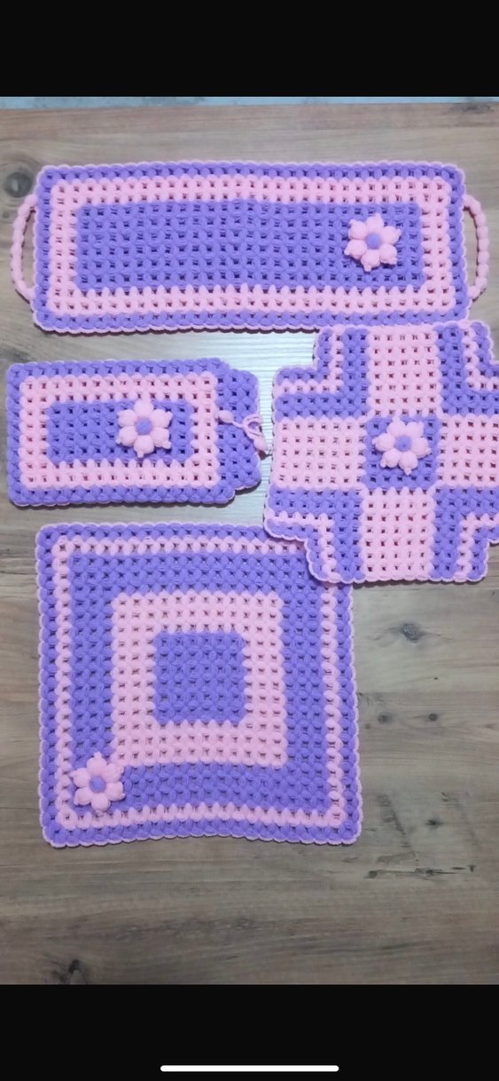 Pastel mor ve pembe renklerde, çiçek detaylı el örgüsü banyo süngerleri seti. Yumuşak dokuludur.