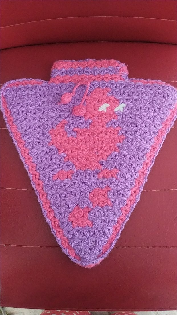 Pastel mor ve pembe renklerde, örme desenli ve ördek figürlü yumuşak banyo süngeri.