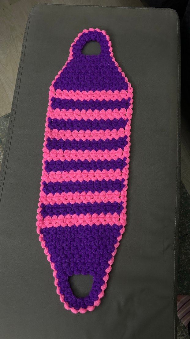 Mor ve pembe renklerde, her iki ucunda tutma yeri bulunan renkli banyo süngeri.