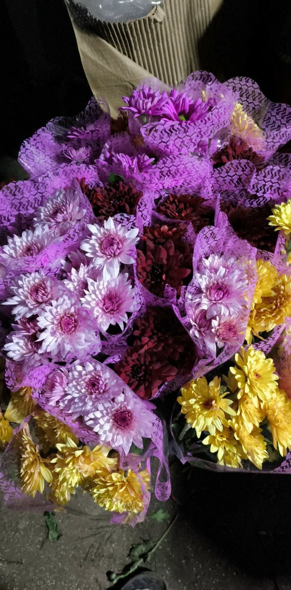 Mor ve sarı renklerde canlı çiçek buketleri, dekoratif kağıda sarılmıştır. Mekanları renklendirmek için uygundur.